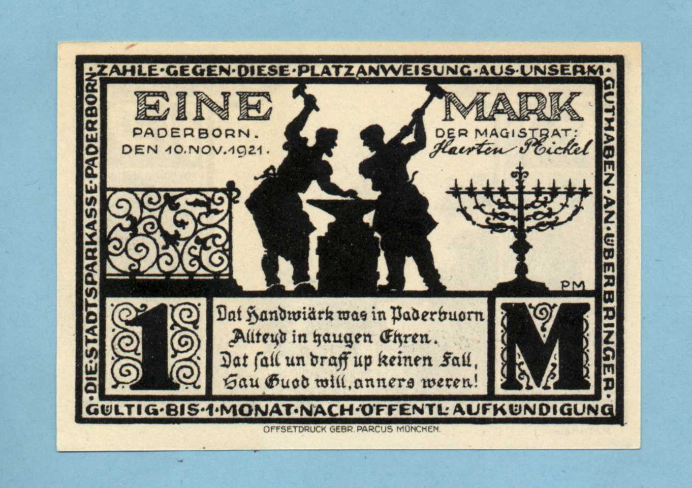 Notgeld paper money from the town of Paderborn . The Notgeld or emergency money was printed by many towns in Germany during the time of hyperinflation. Paderborn was close to Herford where I was stationed in 1048 - 1950. Scanned by Michael S P Lucas. No restrictions on use.