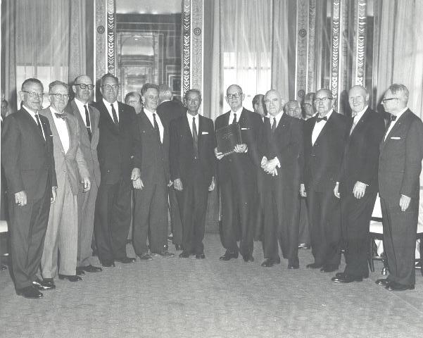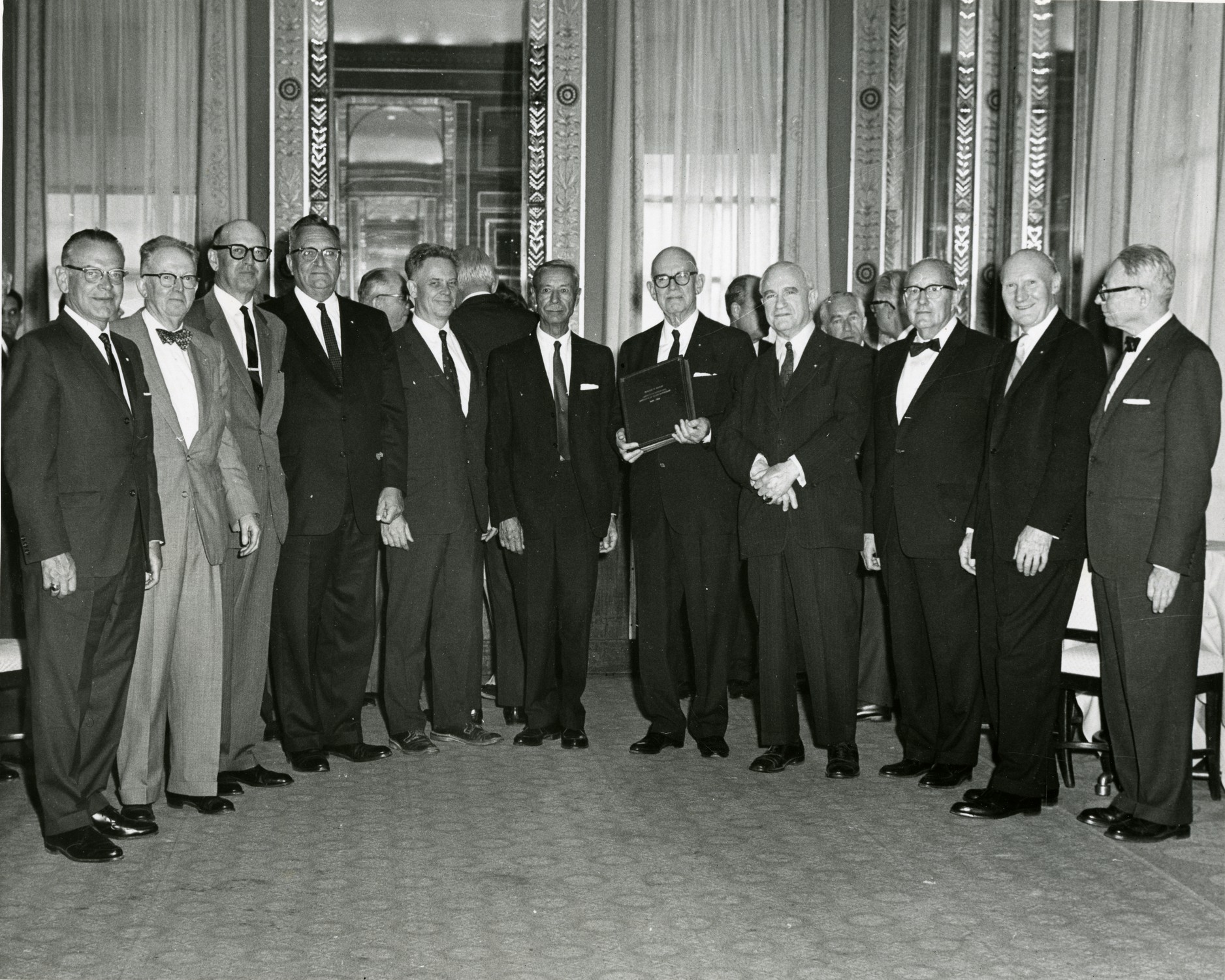 IRE Past Presidents, 1966, L-R: George Bailey, Arthur V. Loughren, Donald G. Fink, John D. Ryder, Donald B. Sinclair, Haraden Pratt, Stuart L. Bailey, Alfred N. Goldsmith, Ivan S. Coggeshall, Ernst Weber, Frederick B. Llewellyn