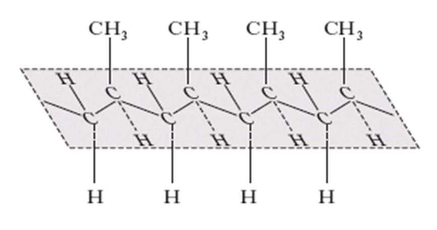 The spatial structure of isotactic polypropylene is obtained with a chemical process called Ziegler-Natta polymerization allowing to chemically link the propylene repeat units and forming a highly ordered polymer chain (courtesy Treccani.it)