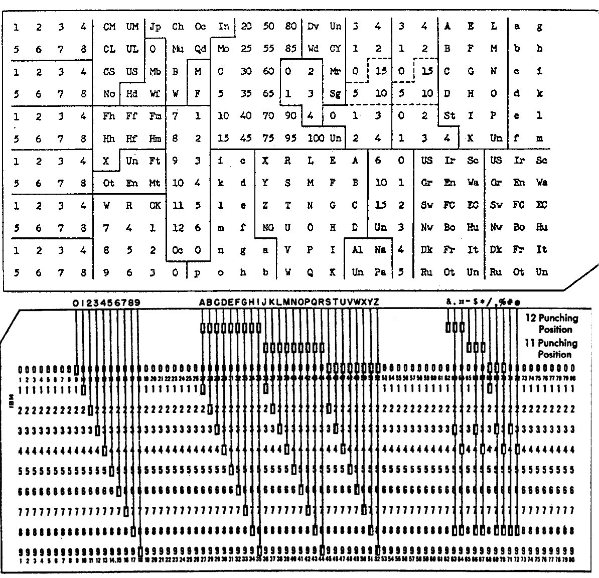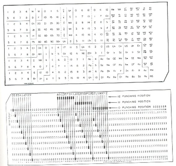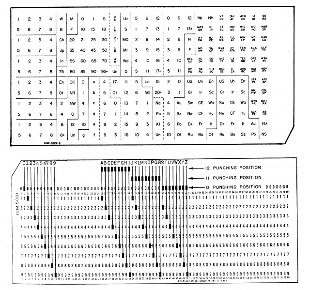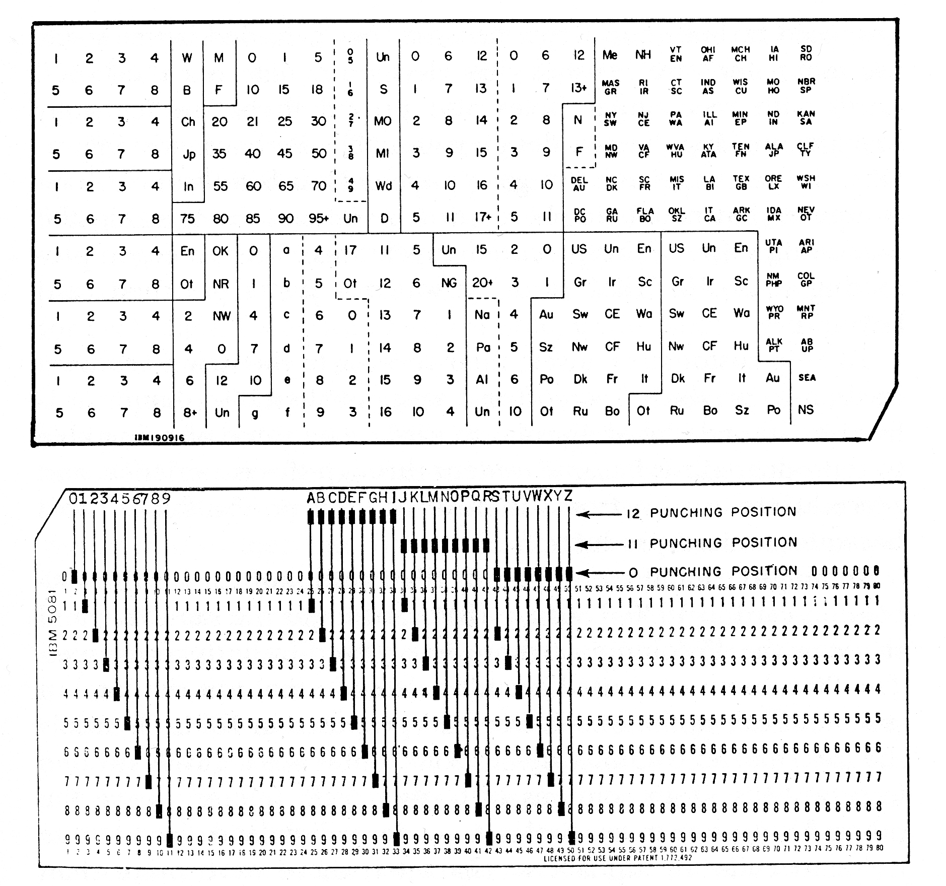 Figure 4. Punched Cards Top: The punched card used to process the U.S. Census of 1900 (unlike the card used in 1890) had information printed on it to facilitate visual reading of punched information. In both cases punched holes were round and the card size was 6 5/8 inches by 3 ¼ inches. Bottom: The IBM 80-column card, with rectangular-shaped holes, replaced the then-standard 45-column card in 1928. By the early 1930s, the two additional rows shown here at the top of the card were introduced to facilitate alphabetic coding. The 10 holes punched to the left show how the numbers 0 through 9 were represented. The 52 holes punched to the right show how two holes per column were used to represent the 26 letters of the alphabet. The 80-column card and the earlier 45-column card were both 7 3/8 inches by 3 ¼ inches.
