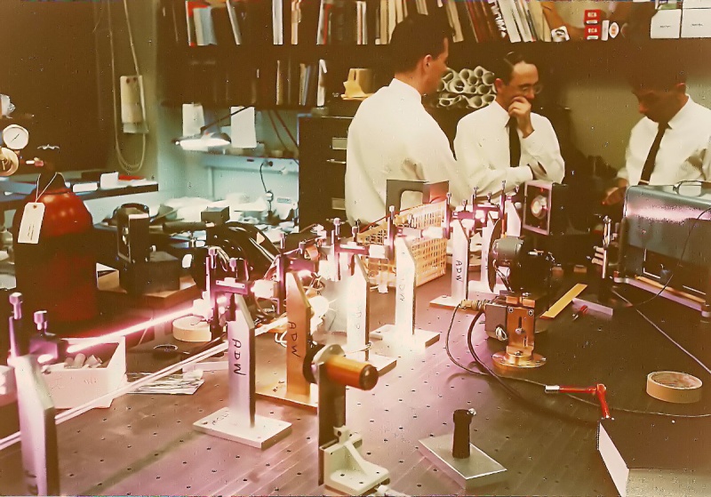 Left to right; Dane Rigden, Alan White and Bill Rigrod engaged in shop talk. The red HeNe on the bench is putting out about 80 milliwatts of coherent 632.8 nm light