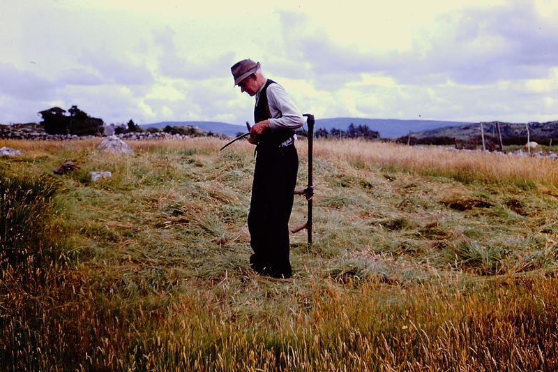 July, 1968, Cycling in Ireland. Farmer using a scythe, different view. Copyright Michael S P Lucas, 1968