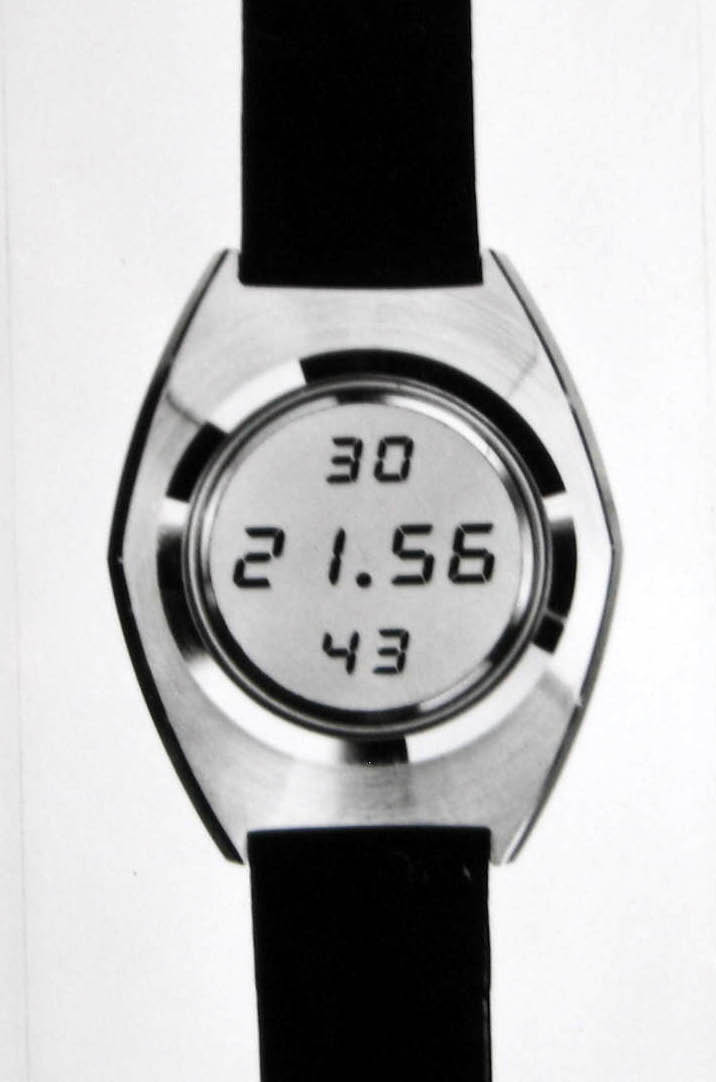 Prototype 8-digit Twisted-Nematic LCD wristwatch of Ebauches Electronics SA, Switzerland, shown at MUBA Fair, March 1973