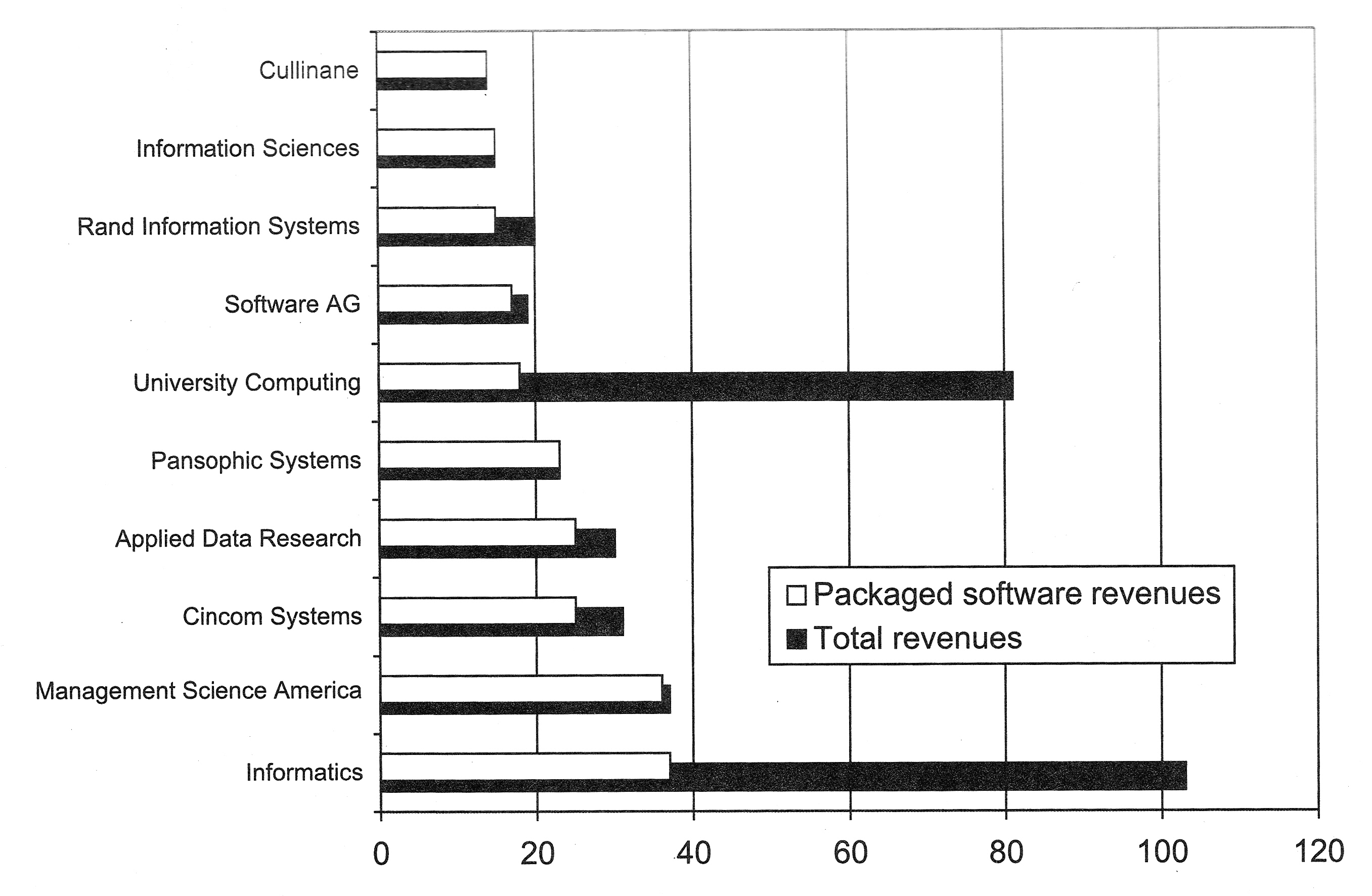 As of 1979 the 10 leading companies had revenues between $5 million and $35 million in software products revenue alone. This chart does not include IBM’s software products revenue. From Martin Campbell-Kelly, From Airline Reservations to Sonic the Hedgehog: A History of the Software Industry (2003), p. 127, courtesy of the author.