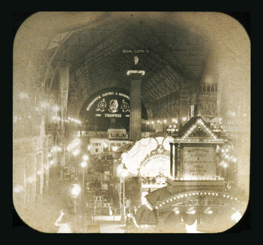 The scene depicted herein shows the interior of the Electrical Building at the 1893 Columbian Exposition, Chicago, Illinois.