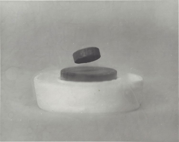 A a Samarium Cobalt magnet levitates above a disc of superconducting Yttrium Barium Copper Oxide cooled with liquid nitrogen in a styrofoam cup.