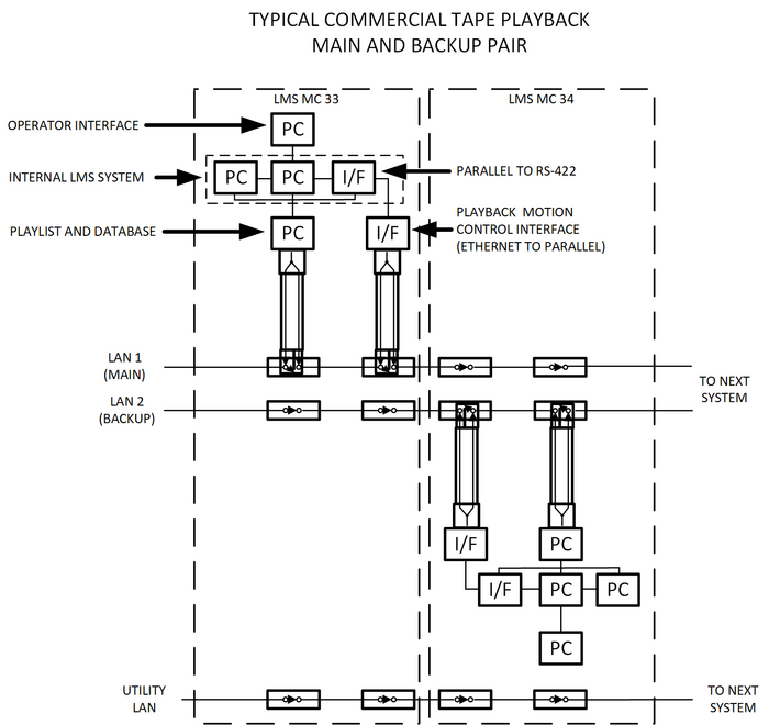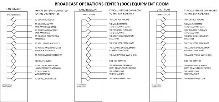 I became involved with BOC as an "in-house" broadcast automation consultant in 1987. I had two previous smaller broadcast automation projects. I joined the project full time in 1988. I designed or contributed to the design of the control rooms, switching systems, automation system, commercial playback systems (Sony Library Management Systems or LMS) and support systems. Each of these systems had multiple interfaces with microprocessors and PCs plus there were gateways to minicomputers that produced the broadcast schedule. They all connected via multiple segments of three Ethernet local area networks. I did the original concept development and design for the BOC local area network (LAN). Prior to this I had only used one small network with about six devices. I had a very steep learning curve for the BOC networks. The network was divided into three LANs named LAN 1, LAN 2, and Utility. The main systems were assigned to LAN 1 and the backup systems were assigned to LAN 2. The utility LAN was for testing or to replace a LAN during repairs. New software and hardware were tested and qualified for use by placing a switcher (or switchers), LMS machines, file servers, and other systems on the utility network. A system of centrally located LAN repeaters for LAN 1, LAN 2, and Utility were used to isolate the three LANs into multiple segments of each to avoid having a fault on one LAN disrupt the complete LAN or other LANs.