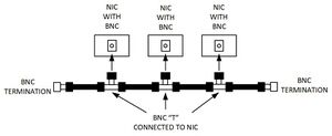 Back in the “dark ages” of computer networks (the BOC network design started in 1988), Ethernet local area networks were limited to two options Thin Ethernet and Thick Ethernet. Cat5 and Cat6 networks were a few years in the future and later replaced the networks described here. Thin Ethernet or Thinnet (also called ThinNet) was officially called 10 Base-2. It used an RG 8A/U (0.4-inch diameter) coaxial cable. The cable ends were terminated with BNC connectors. Each device on the network was connected to the network through a BNC "T" and each end of the network had a 50 Ohm terminator attached. Each node on the network had to be a minimum of 0.5 meters (1.5 feet) apart, and the overall length of the network segment must be less than 185 meters (606 feet).