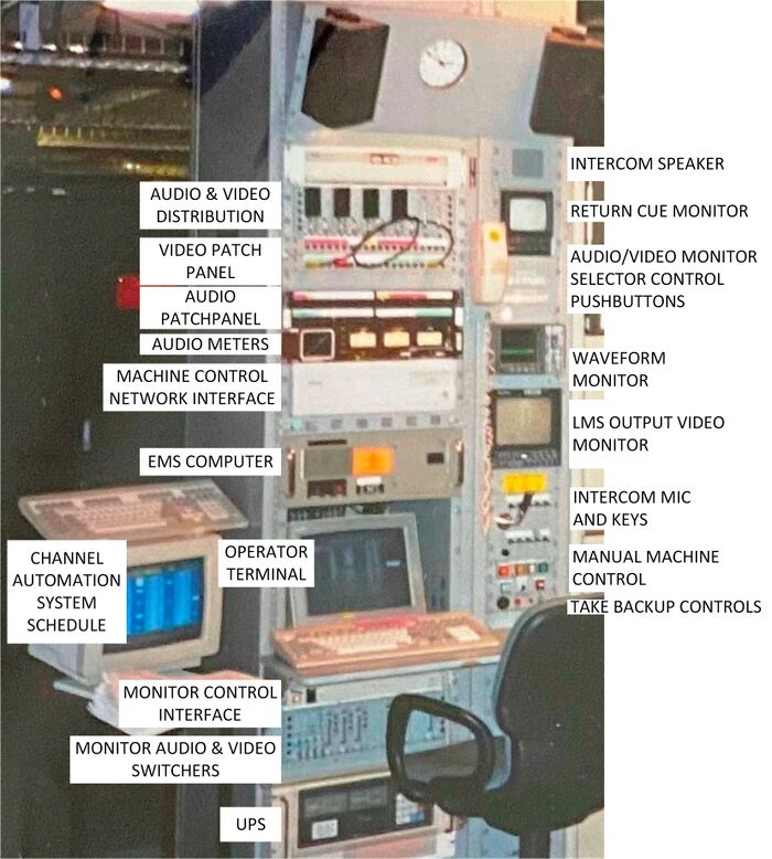 I designed or contributed to the design of the control rooms, switching systems, automation system, commercial playback systems (Sony Library Management Systems or LMS) and support systems. Each of these systems had multiple interfaces with microprocessors and PCs, plus there were gateways to minicomputers that produced the broadcast schedule. They all connected via multiple segments of three Ethernet local area networks.