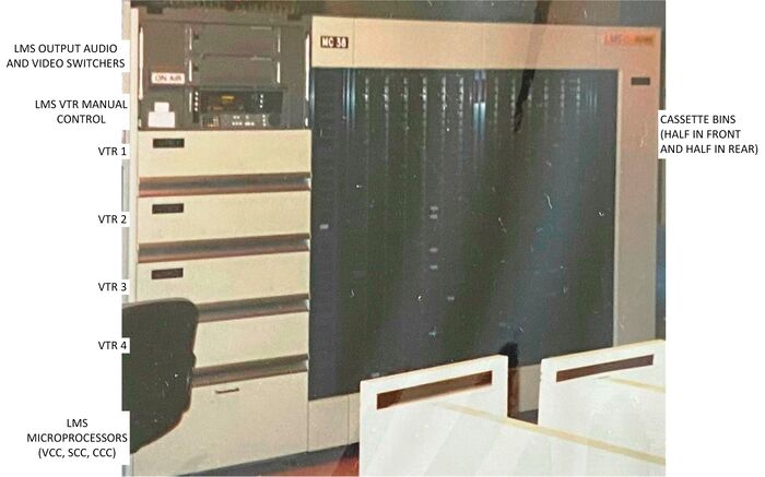 The LMS loaded all four of the VTRs and waited for a play command from the automation system. At the beginning of the commercial break the automation system sent a play command to play each tape in the order in the schedule. As soon as the next cassette started the elevator was sent to the VTR to retrieve the previous cassette and returned it to the storage bin where it was stored. Then then another scheduled cassette was retrieved. The entire process continued until the commercial break ended and the next four cassettes were loaded for the next break. The procedure was so fast that ten to fifteen second commercials could be played back-to-back.