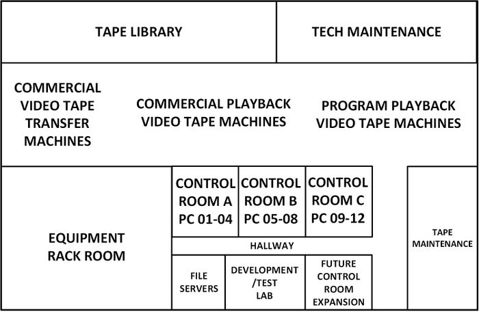 The diagram below shows a very simplified network layout for BOC. Boxes with main also had a backup that is not shown here. The commercial playback box represents several devices at each of ten machines. The program playback box represents ten machines. The still store and character generator box represents six of each of the devices. The maintenance monitoring box and the support equipment in the equipment rack room box represents several devices. The control interfaces box represents several devices throughout BOC.