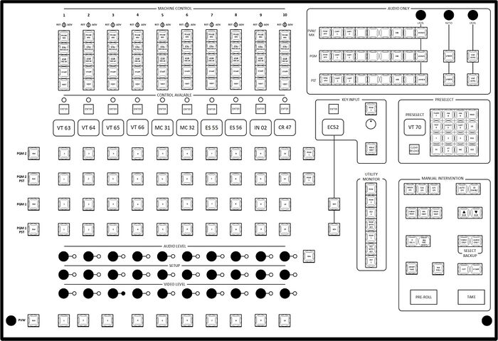 Each control room had a CBS supplied TAKE BACKUP panel with 10 buttons marked PC 01 through PC 10. The buttons were enabled for the switchers in a particular control room as well as for each Aux switcher assigned to the control room. A lamp in the button will indicate when the switch was enabled.