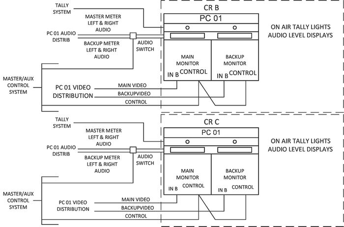 If this panel were in CR B and that room had programming on PC 05 that pushbutton would be lit indicating the operator had control of the Take Backup function for PC 05. The grayed-out pushbuttons are not lit. The pushbuttons that are lit are enabled by the automation system. If the pushbutton was pushed to take the backup the PC 05 pushbutton would flash. If that control was also assigned PC 09 as an Aux Channel, then the PC 09 pushbutton would be lit. If the operator took the backup source for PC 09 to air, then the PC 09 pushbutton would flash. Nothing would happen if an operator pushed a Take Backup pushbutton for a channel not assigned to that room. The automation system provided tally closures for each switcher to indicate which PC outputs were assigned as auxes for a control room's two switchers. The automation system used the closures to light tally lamps above the video monitors, switch the monitors’ video input from black to the PROGRAM (MAIN) and BACKUP video, and enable the audio level display. Black on the monitors not assigned to a control room cut down on operator distractions.