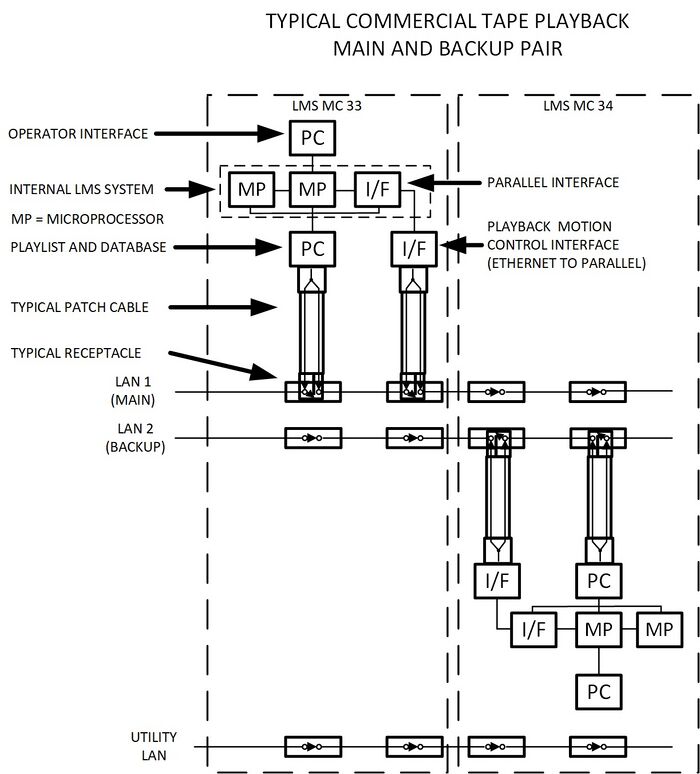 The diagram below shows two multicassette commercial playback machines (LMS) in the usual main and backup configuration. The connections were split between LAN 1 and LAN 2. The LAN loops through each device’s patch cable and connector.