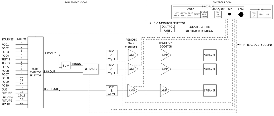 One Program Monitor System and one Test Monitor System had facilities to select stereo, stereo plus mono, mono, left only, right only, and Second Audio Program (SAP) – second language – audio. In the stereo plus mono mode, stereo was heard in the left and right speakers simultaneously with mono in the center speaker. Mono audio abnormalities stood out in sharp contrast to the left and right channel sound. The mono, left only, right only, and Second Audio Program (SAP) functions selected just those modes to isolate those channels individually for closer scrutiny if a problem was suspected.