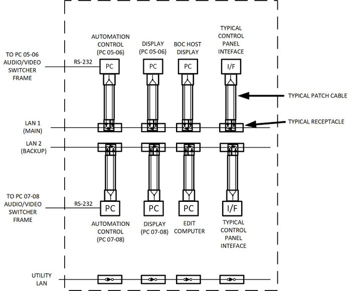 The BOC had control rooms, switching systems, automation systems, commercial playback systems (Sony Library Management Systems or LMS) and support systems. Each of those systems had multiple interfaces with microprocessors and PCs plus there were gateways to minicomputers that produced the broadcast schedule. They all connected via multiple segments of three Ethernet local area networks. BOC was the first time CBS used a large, shared data network for controlling broadcast equipment. In the past, RS-232, RS-422, and parallel port control lines were used.