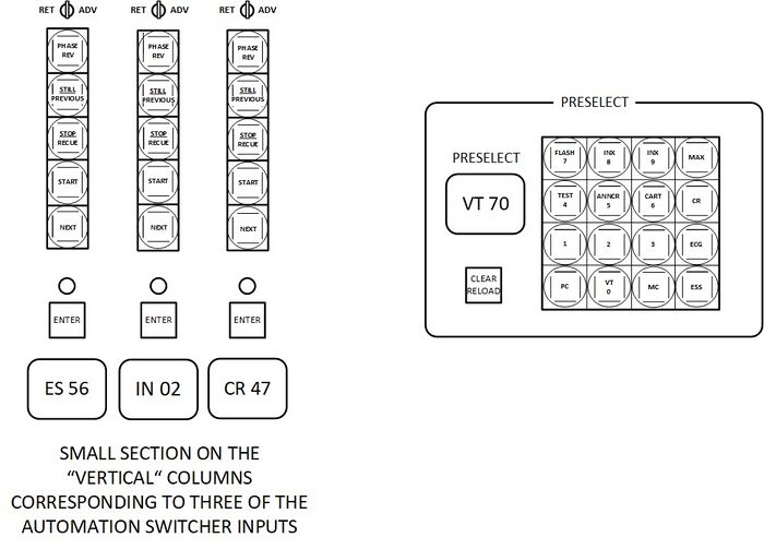 To assign one of the hundred sources to one of the Automation Switcher inputs the operator used the PRESELECT keypad on the switcher panel. The first entry would have been to choose the input type such as program video tape playback machine (VT) or commercial video tape playback machine (MC). The source type then appeared in the PRESELECT display. Next the source two-digit number was entered. The number appeared in the display next to the source type. After confirming that the entry was correct the operator would assign that source to one of the ten automation switcher inputs by pressing the ENTER pushbutton for that input. That is shown here on the left of the PRESELECT section. After ENTER was pushed the source name would appear in the display for the switcher input. The switcher system would then make the audio, video, control, and other switching. There was an indicator light above the ENTER pushbutton on each Automation Switcher input that was lit when the machine operator assigned control to the automation system when the machine was ready.