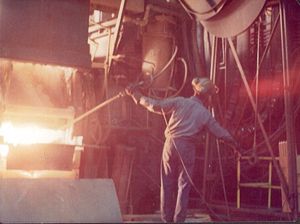 At another location I visited, the operators played a game during slagging. One would get set to shove the hoe into the furnace and pull slag out, and the other would look over the railing to the main building aisle below. If he saw any white collar types walking down the aisle, he would signal the operator when to pull the slag. The resulting shower of sparks below would burn little holes in the victims’ neckties and white shirts !