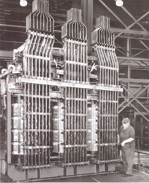 After charging, the roof structure would be swung back into place and secured. Three large cylindrical graphite electrodes (for three-phase operation) were suspended over three corresponding holes in the furnace roof in a triangular pattern. These were manufactured, by Union Carbide, in sections roughly 18 to 24 inches in diameter and about six feet in length (I am relying here on my sometimes unreliable memory).
