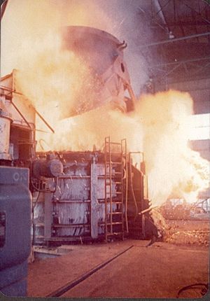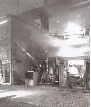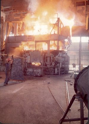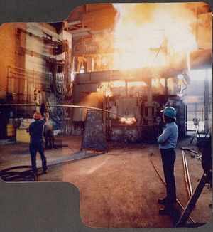 After the charge had melted down into a molten pool, the operation of the furnace settled down to just a steady loud roar. The process of converting the raw scrap into refined metal took a few hours. In spite of the intense heat in the furnace, the helper would sometimes have to use an oxy-acetylene torch or an oxygen lance to burn away solidified metal at the tap hole when it came time to tap the furnace into the ladle.