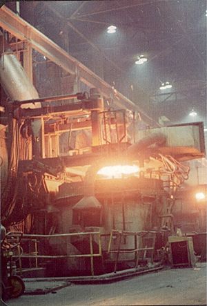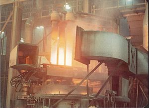 The entire furnace structure was raised above the Melt Shop floor to allow for the tapping of the molten metal into a refractory-lined ladle suspended from a crane on the far side of the furnace. The furnace itself was tilted in order to accomplish this.