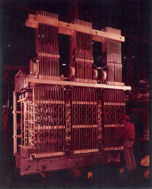 At all locations, the transformers were similar in design and construction. They were all oil-filled, water-cooled units and were always located inside concrete block vaults immediately adjacent to the furnace. The high current three-phase power was conveyed from the transformer secondary bus bars to the furnace electrodes by means of flexible air-cooled or water-cooled cables (to accommodate the raising and lowering of the electrode support arms).