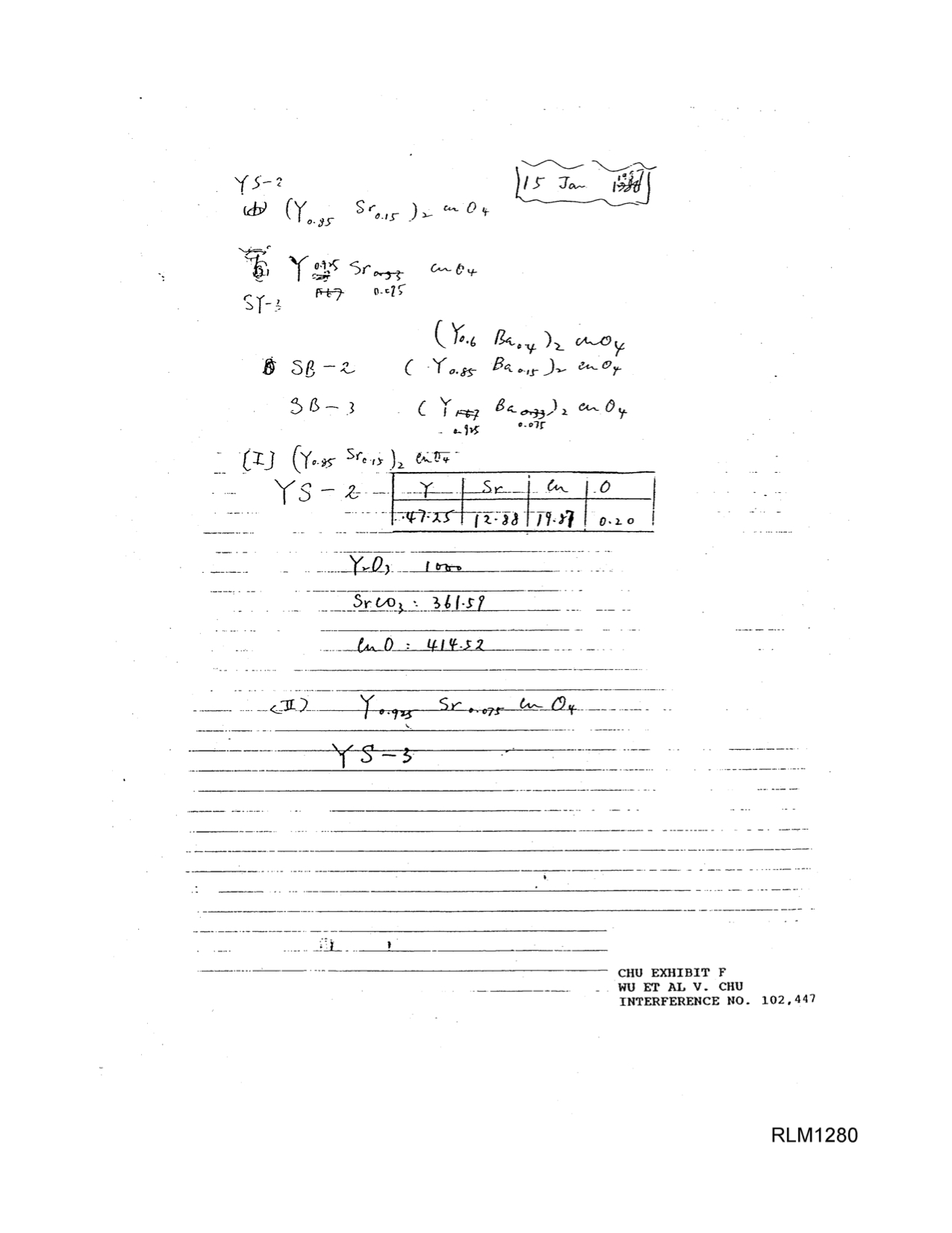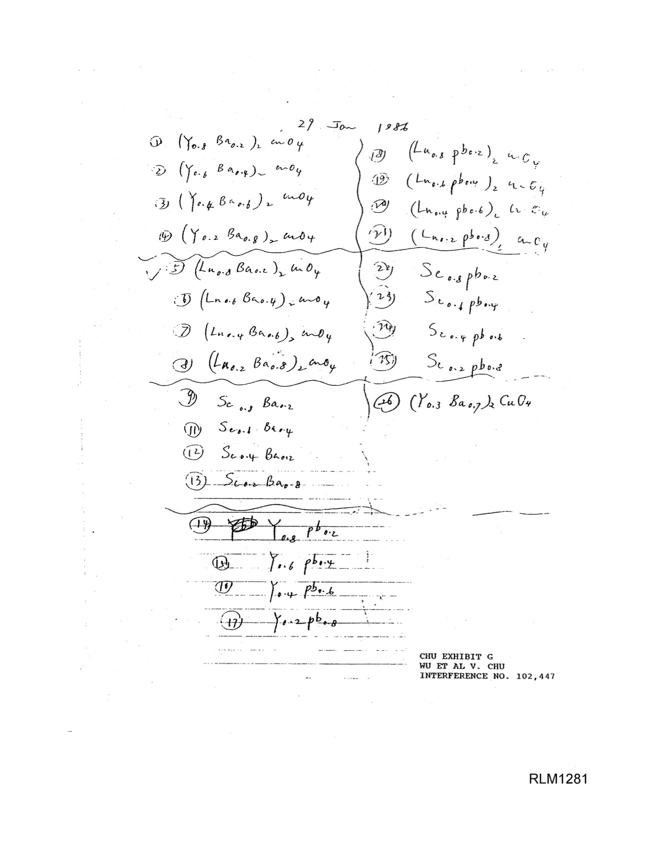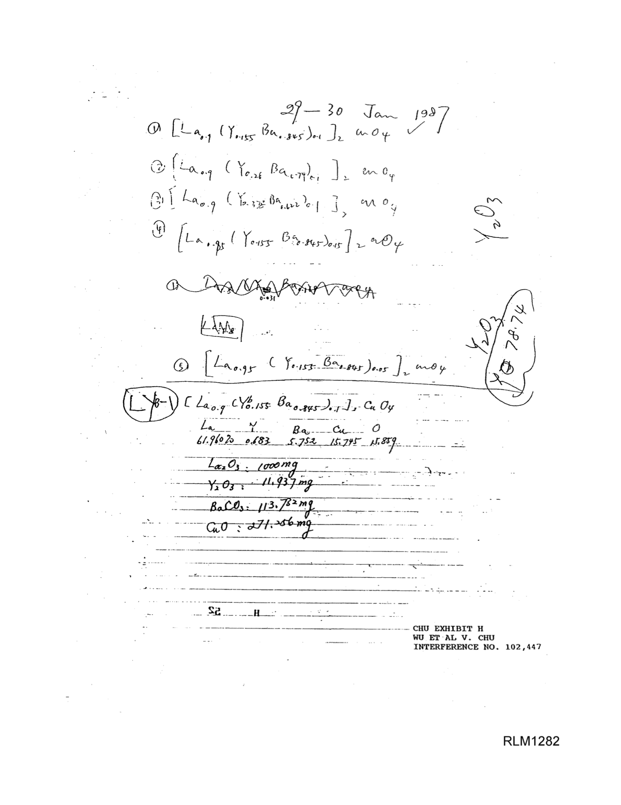 It is perhaps a good time to use my scratch notes here to point out that the oxygen ratio was frequently omitted in our shorthand for the candidate compositions. Technically, the chemistry convention is that an omitted subscript implies a one, but in the case of these mixed-valence materials, the precise oxygen concentration in the processed samples was an unknown, a function of the processing conditions, and irrelevant to weighing out appropriate amounts of the starting materials (which could be oxides, carbonates, or even hydroxides of the appropriate metals). (Unfortunately, the patent court would ultimately interpret the frequently-omitted subscripts as implied ones and, ignoring a decade of arguments made by both sides in the case, decide against UAH based upon a point never raised by either party – that we made, quite impossibly via heating in air or pure oxygen, some kind of bizarre (Y0.6Ba0.4)2CuO1 “sub-oxide.”[67] [68])