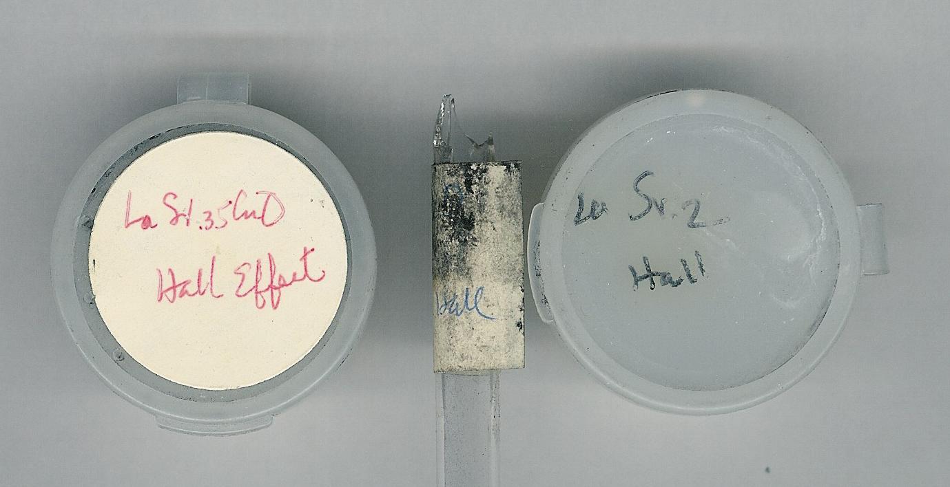 The first samples recorded after returning to Huntsville were milled versions of these two compositions, labeled “finely ground” in our notebook (UAH Lab Notebook page 18).[39] The tests on January 7th were impatiently tested in liquid nitrogen while still awaiting the arrival of liquid helium, as good metallic behavior at the higher temperatures would still be indicative of a better quality sample. Several of the calcium tests on January 9th and 10th (including CA7, CA8, and CA9) subsequent to the arrival of the helium showed complete transitions centered around 20 K, while a sample of La1.8Mg0.2CuO4, made about the same time, was found to be insulating.[40]