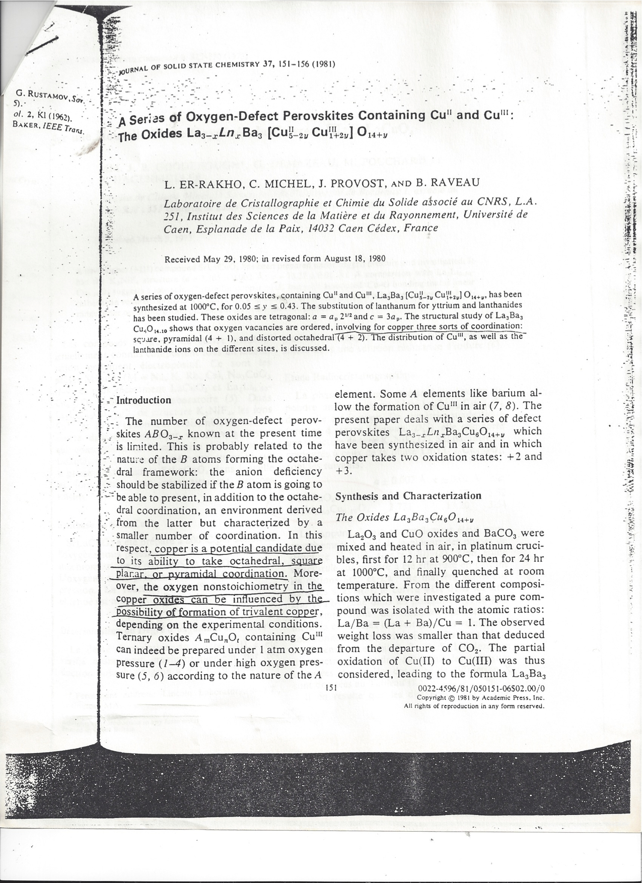 - ↑ L. Er-Rakho, C. Michel, J. Provost, B. Raveau. “The Oxides La3-xLnxBa3Cu(II)5-2yCu(III)1+2yO14+y.” Journal of Solid State Chemistry 37 (1981): 151-156 Media:070ErRakhoEtAlFromAshburn.jpg.