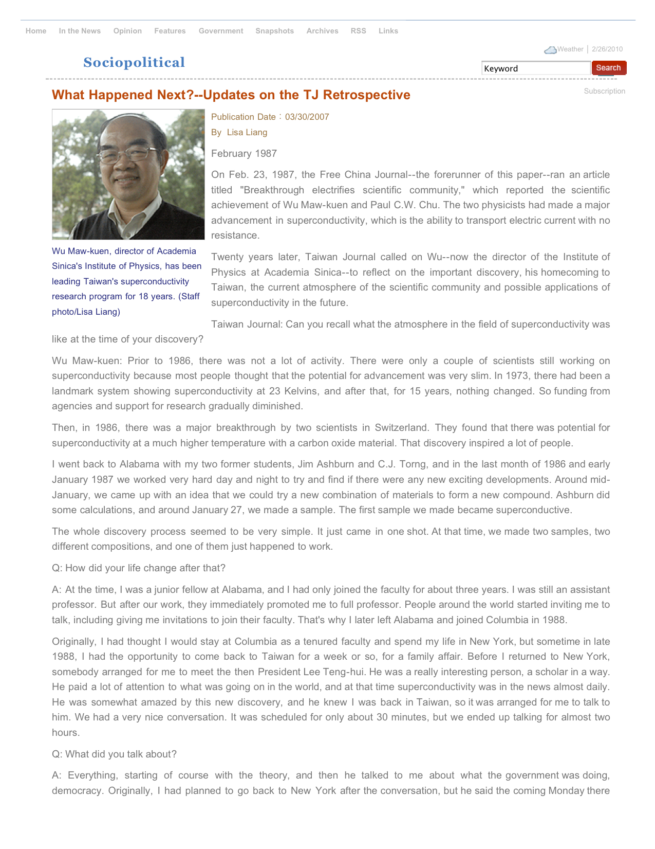 - ↑ “What Happened Next? -- Updates on the TJ Retrospective.” Taiwan Today (30 March 2007). <http://taiwanreview.nat.gov.tw/fp.asp?xItem=24060&CtNode=205> or <http://taiwantoday.tw/ct.asp?xItem=24060&CtNode=436> Media:830VolumeMatchingWuTaiwanToday2007.jpg.