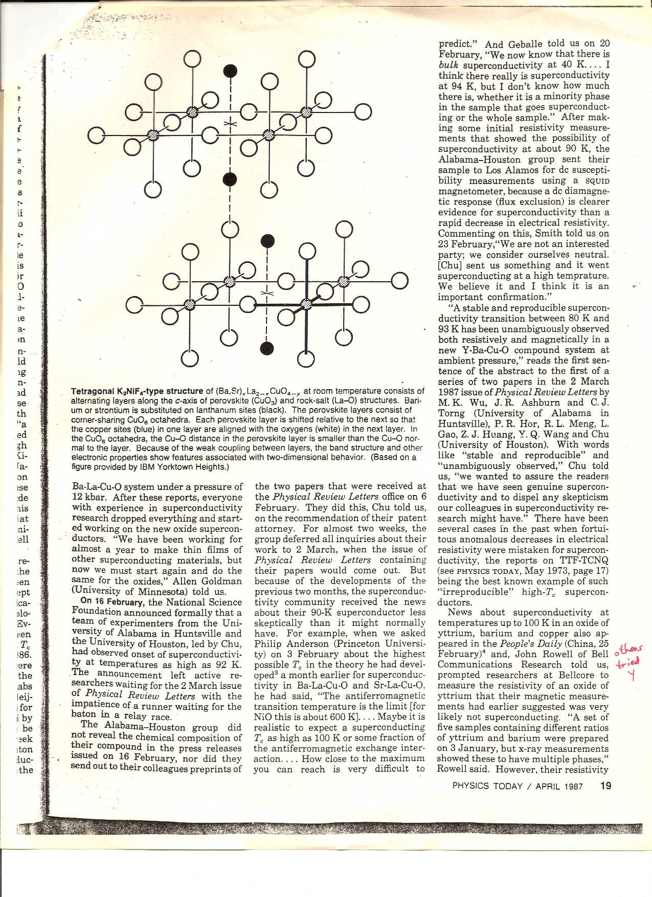 It seems far more plausible to me that Ruling later read of the yttrium oxide search in the May 1987 U. S. News & World Report article[74] and subsequently convinced herself that she had prompted Wu. Not coincidentally, that article, in the same paragraph, mentions both the yttrium oxide coming from NASA and happens to quote me (I was rarely interviewed for national publications as those reporters typically contacted only Houston). I do not specifically recall speaking with that particular author, but I have no doubt that I was the one who related the story of searching for and obtaining the yttrium oxide. It was a significant event in my mind because so many friends assisted my search.