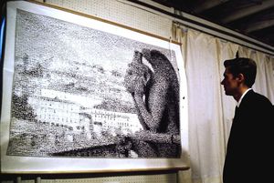 The technique was used to digitize and pixilate (using an 11x11 matrix of small images, mostly electrical and electronic circuit elements) a picture of a reclining nude in 1966. Harmon took the photo and collaborated with Knowlton in creating “The Nude” – blown up to a 5-foot by 12-foot enlargement from the computer-generated microfilm – and which received publicity in The New York Times. (October 11, 1967)[10][11] “The Nude” was shown in the Museum of Modern Art’s The Machine as Seen at the End of the Mechanical Age in 1968.[12] Knowlton relates how they tossed a coin to determine who would be listed in the museum catalogue as the “artist” (Harmon) and as the “engineer” (Knowlton). Another of the many computer-generated images thus created was called “Gargoyle.”