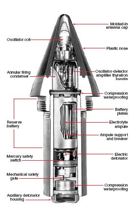 The ‘40s also brought forth the development of the Variable Time (VT) fuse (Fig. 2) (as opposed to fixed time mechanical fuse). The VT fuse was somewhat like radar in that it operated on target reflected radio signal to detonate the shell. The vacuum tubes in the VT fuse had to withstand launch shocks of as much as 10,000 g’s when fired from a gun. The VT fuse was developed by the Johns Hopkins Applied Physics Lab (APL).