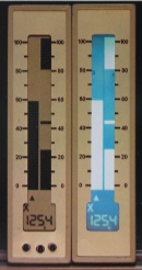 A different solution was developed for panel-mounted meters that were proposed by BBC for power and industrial control centers. Reflective TN LCDs were conceived as bargraph replacements for conventional electromechanical meters, but were difficult to read under low ambient light, as they are mounted vertically. Therefore, we used a cold-cathode fluorescent lamp (CCFL) and a diffuser to backlight our bargraph display as shown on the right-hand side of the picture. This was much easier to read than the purely reflective type on the left.