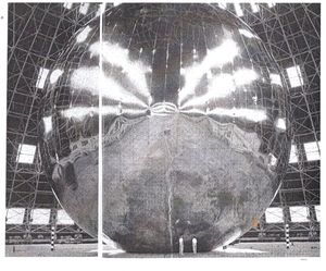 Figure 2 is a photograph of ECHO I taken in a dirigible hanger. The surface is made of mylar coated with a thin film of aluminum several mils thick. The spherical surface is constructed of 4 foot panels (at the equator). Panels are connected with a narrow coated mylar strip. The 100 foot balloon was folded to fit into a 3 foot container for launch.