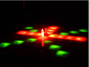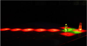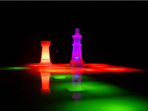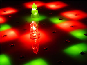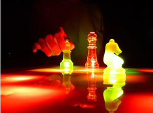 “ a chess set comprising a playing board and a plurality of playing pieces, each piece being movable between playing positions on the playing board in accordance with a predetermined pattern which is influenced by the locations of other playing pieces. Each playing piece is encoded in accordance with its identity, and each playing position automatically responds to the encoding when it is occupied by a playing piece. An electrical circuit associated with the playing position causes other positions to which the playing piece is capable of moving to be illuminated with an appropriate color. Each playing piece includes light sources which are illuminated when the playing piece is in jeopardy of being captured by an opposing playing piece or is covered by a friendly playing piece. The intensity of attack and the depth of cover may also be indicated.”