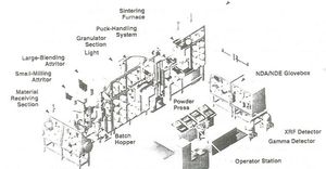 To accomplish the ceramification results described in the APPENDIX, the PuCTF System performed as follows: a linear 5-stage robot Hopper Transport System Z1-Z5 loads the powder hopper with bagged-in Pu and the ceramic ingredients with neutron absorber, gadolinium; transferred this powder into a small attritor; unloads the attritored powder after the milling operation and transfers it into the large attritor; unloads the attritored powder after the second milling operation and transfers it into the granulator; unloads the granulated powder after the granulating operation (before and after each of these loading and unloading operation, the hopper is weighed to be sure all powder has been unloaded, if not that operation is repeated and the operator alerted) and transfers it into the 60 Ton press powder reservoir; after a measured quantity is compressed into a green puck (this operation is repeated until all of the powder has been compressed), it is picked up and placed on the size and weight measuring station by the articulating robot; after the green puck is sized and weighed, it is picked up by the articulating robot and loaded in an ordered manner on to the shelves of the bottom loading furnace (this sequence of steps is repeated 24 times to fully load the furnace); when full, the bottom is raised closing the furnace, the pucks are sintered during a furnace heating and cooling cycle, then the furnace bottom is lowered; the articulating robot picks up the sintered pucks one by one from the furnace shelves, places each puck on the sizing and weighting station; then following the measuring process, places the pucks into a bag-out storage can using a puck pickup vacuum tool.