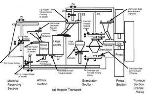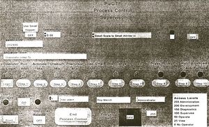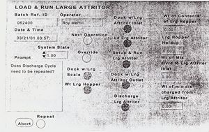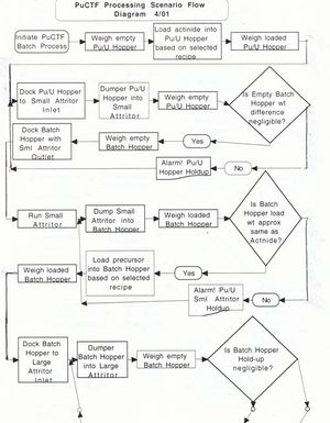 The Supervisory Control & Data Acquisition System was designed so that during the check-out and certification procedure, the operator at a console was able to interactively supervise each step/process, monitor its results, then if satisfactory, signal the operational supervisory control to execute the next process step. (See Roy D. Merrill, “In Support of the Plutonium Immobilization Program,” LLNL Report, April 12, 2001) The following examples taken from this report show the partial flow diagram of the logical steps taken in loading actinide, and processing it in the small and large attritors.