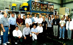 My assignment in the development of a plant prototypic system for immobilizing waste Plutonium (some 13 Tons) accumulated from the Nuclear Weapons development, production and disassembly programs, was to design and implement: (1) the plant processing stations operational system data acquisition and controls, and operator station controls; (2) the powder hopper two degree-of-freedom 5-stage linear robot program controls; (3) the compressed and sintered pellet/puck three degrees-of-freedom articulating robot program controls; and (4) complete the pellet size and weight measuring station. The ceramic form was made by blending plutonium oxide with ceramic precursor materials and a neutron absorber. The mixture was calcined, cold pressed, and sintered (furnace heated, but not melted) into a dense form, then loaded into small cans. In the operational version of this plant, these cans are to be placed inside a large storage canister and surrounded by glass made with highly radioactive waste, then stored in an underground repository. The PuCTF (Plutonium Ceramification Test Facility) is pictured below in schematic and photo image form followed by a photo of the project staff. The facility was housed in a 18 ft long x 3 ft wide x 12 ft high glovebox.
