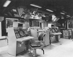 To allow the maximum number of people to see the scope face, we estimated that the display surface should be tilted down about ten degrees from the horizontal toward the front side of the console. At that time, I was also the manager of an exploratory development program searching for a practical large panel display technology that could be adapted to a warship application. I was already pursuing a form of liquid crystal display that went to sea about 1968 and was eventually installed in amphibious command ships and Aegis Weapon System ships, but there was nothing I knew of that was immediately available in a rugged configuration that could (with high resolution) react in micro seconds. This was 1964 and we had only three years from “go-ahead” to fleet operations. A “solid state” large panel display was still a dream. We knew we would have to settle for a cathode ray tube display, but it had to be as large as possible.