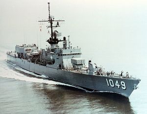 On 28 August 1976, Voge was in company with USS Moinester (FF-1097) in the Ionian Sea off Crete, when she saw the periscope of a Soviet ECHO class guided-missile sub, later identified as the K-22, apparently shadowing Moinester, and apparently unaware of Voge’s presence. For about two hours Voge’s crew kept K-22 under surveillance, even to the point of getting a number of photos of the periscope. K-22’s skipper apparently lost track of Moinester a number of times, and appeared to loose her completely at about 1815. At about 1825, the sub skipper noticed Voge for the first time and realized he was about to collide with her. Too late he ordered an emergency dive, and seconds later K-22’s bow and sail rammed Voge’s port quarter. The impact tore open part of Voge’s hull and caused the after steering room to flood, as well as tearing off part of her single propeller. The shock also caused injury to a sailor who was knocked from the 01 level to the main deck. K-22 stayed afloat, but suffered severe damage to her bow and sail. A Soviet ship showed up to escort the stricken submarine to port. With part of her propeller gone and flooded after-steering, Voge was taken in tow by Moinester, and later by the salvage ship Preserver who towed the DE to Toulon, France, where she had to be dry docked for repairs.