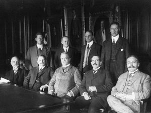 23 April 1915 saw the first meeting of the Advisory Committee for Aeronautics in the office of the Secretary of War. Standing from left to right: Holden C. Richardson, naval instructor; John F. Hayford, Northwestern University, Ill.; Capt. Mark L. Bristol, director of Naval Aeronautics; Lt. Col. Samuel Reber, Signal Corps. In Charge, Aviation Section. Seated: William Durand, Stanford University, Calif.; S. W. Stratton, Director, Bureau of Standards; Brig. Gen. George P. Scriven, chief signal officer, War Dept.; C.F. Marvin, Chief, United States Weather Bureau; Michael I. Pupin, Columbia University, NY. Present, but not in the photo: Joseph S. Ames, Johns Hopkins University, Baltimore, Md.; Hon. B. R. Newton, Asst. Secretary of Treasury. Charter member Orville Wright did not attend, but would be at later meetings. NACA photo