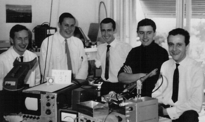 The persons on the picture can bee identified from left to right: Charles-André Dubois, technicien horloger, François Niklès, technicien horloger, Jean Hermann, ingénieur électronicien EPUL, Richard Challandes, technicien horloger, Charles Frossard, technicien horloger. As opposed to the CEH governing assembly and its president and many other "illustrious personalities" in the well regulated Swiss watch industry the people on the picture really did believe in quartz wrist watches, which can be readily concluded from there smiling faces. - Worth mentioning one floor above was located the very first semiconductor pilot line in Switzerland, under the direction of Kurt Hübner, physicist ETHZ and his outstanding crew, who produced and delivered the first low power integrated circuits (IC) needed to operate the QWW, an other "first" by the CEH. - Amongst the equipment and instruments in front one can see a Tectronix oscilloscope and a hp frequency synthesizer. On the scope is placed a honorary plate and a hand written document indicating: "0.189" and "Beta I". Photo copyright R. Challandes, courtesy J. Hermann, who has been very helpful in historical research on the first QWW.