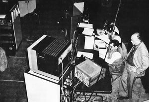 Figure 1 provides an overview of the equipment constructed and assembled for the demonstration at KPIX. On the left side are the racks housing a Vidifont graphics generator and a slide scanner. In the rear on the left is a component video tape recorder. At the right center are two NTSC tape recorders. Figure 2 provides a view of the control desk. The individual who is standing is the “producer,” Ken Davies, chair of SMPTE's Working Group on Digital Video Standards.