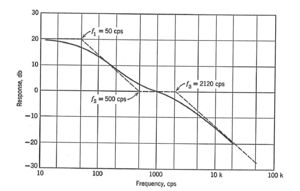LP records were cut with pre-emphasis to preserve their response at high frequencies. The standard for this was set by the Recording Industry Association of America (RIAA). In order to compensate for this pre-emphasis, it was necessary to tailor the playback characteristic of the amplifier, as shown in Fig. 1. using the historical notation of cycles per second (cps). Here, the response was required to be flat from 500 Hz to 2120 Hz; falling at 20db/decade beyond 2100 Hz; rising at 20db/decade below 500 Hz, and eventually becoming flat below 50Hz. We chose to make this compensation at the front end, to minimize the operational dynamic range for the transistors.