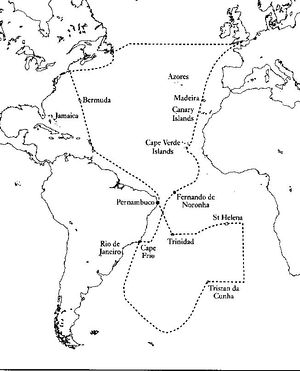 Halley’s great contribution was the invention of the isogonic map. He set out to map the lines of constant variation over the Earth’s surface. The hope was that lines of constant variation could somehow be translated in a one-to-one manner to longitude. In 1693, with the full support of the Royal Society, Halley proposed to the government that it fund a voyage around the world in order to measure and map the phenomenon of variation as away of determining longitude. Queen Mary II approved all of elements in Halley’s petition. The outbreak of hostilities with France delayed Halley’s expedition. Finally, in 1698, set sail on the Paramore, on a 52 ft vessel built for the expedition. The Admiralty had reduced the geographic range of Halley’s investigation to the North and South Atlantic.