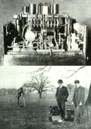Between 1902 and 1905 they secured patents for the commercial use of potential-difference observations for resistivity and formed The Electrical Ore Finder Limited. Soon they were troubled by serious difficulties due to induction between the transmitter and receiver (FIG.7). They also noted that ore bodies changed the intensity of the electric field, and equipment could detect a lode but not its extension and richness. These technical issues much contributed to numerous unsatisfactory results. But the ultimate reason of their failure and bankruptcy in 1905 was that they collected the data only in a subjective manner with the listener device, without creating an archive of recordings to compare.