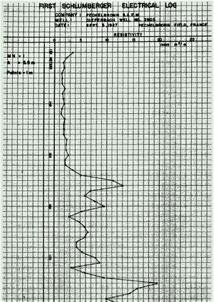 Schlumberger's firm after 16 years (1911-1927) of study, experiments, and implementation of ores and petroleum research technology developed the downhole wireline system called in French Carottage Électrique - electrical coring: a set of tools and methods based on the electric resistivity used for the first time on September 1927 to detect differences in the porosity of the sandstones of petroleum fields (FIG.8).