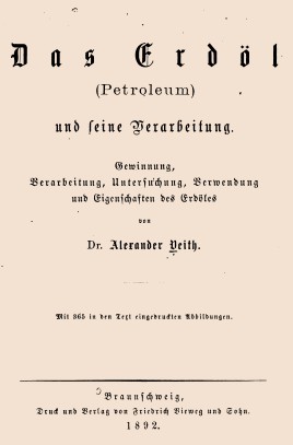 Veith, Alexander. 1892. Das Erdöl (Petroleum) und seine Verarbeitung. Gewinnung, Verarbeitung, Untersuchung, Verwendung und Eigenschaften des Erdöles. Braunschweig, F. Vieweg und Sohn.