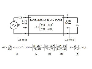 A crucial task in transmitter, amplifier, receiver, antenna and other RF applications is design of an impedance matching equalizer network as shown in Figure 1. The goal is to transfer power from source to load by transforming complex load impedance ZL=RL+jXL to match a resistive or complex source impedance ZS=RS+jXS over a wide frequency band. These impedances are usually measured at a finite number of radio frequencies. Sinusoidal source voltage E at any particular frequency is applied to lossless equalizer input port 1 through ZS, which can provide the maximum-available source power PaS to the load ZL when input impedance Z1 = R1+jX1 = ZS* = RS−jXS (conjugate of ZS) according to equations (1) and (2). Otherwise, there is some power mismatch MM², which is the per-unit power reflected by the equalizer. Power mismatch is also expressed as Return Loss: RL = −20Log(MM). The goal is to find an equalizer network that minimizes the mismatch, thus maximizing the transducer gain GT in (1). Conjugate matching is not physically possible over a finite frequency band (Carlin and Civalleri, 1998:180). Note that reference page numbers may follow the citation year.